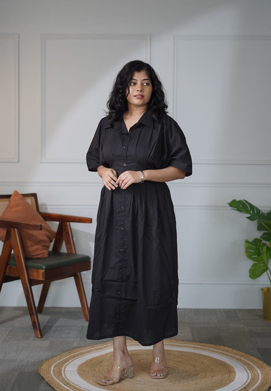 Elira PitchBlack Pleated Cotton Shirt Dress